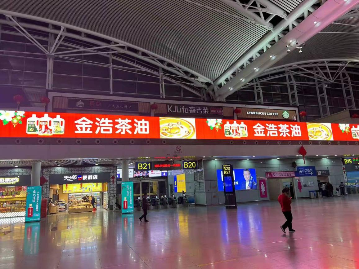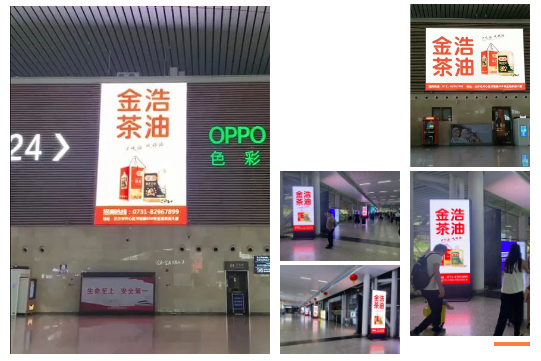 金浩茶油以具備強(qiáng)大聚客效應(yīng)和場景共情特征的高鐵車站為核心,先后在長沙高鐵南站、廣州高鐵南站、深圳高鐵北站上刊多種媒體。超百米環(huán)屏廣告,霸氣“種草”,直擊目標(biāo)消費(fèi)者,成為商旅人群進(jìn)站、取票、候車、購物、休息等各個環(huán)節(jié)不可忽視的視覺焦點(diǎn);LED大、小屏廣告,震撼吸睛,進(jìn)一步完善并強(qiáng)化目標(biāo)消費(fèi)者的關(guān)注點(diǎn)攔截。