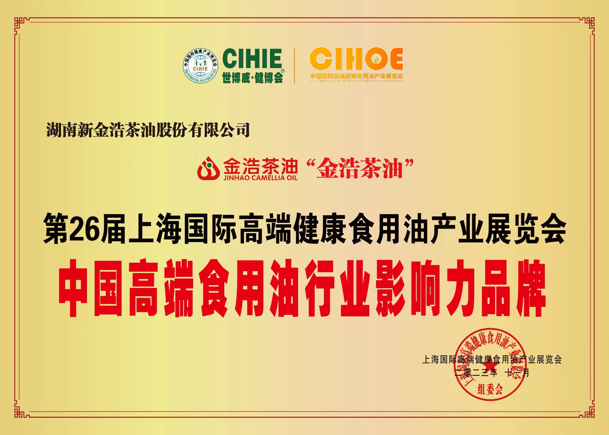 2023年11月8日至10日,第31屆中國國際健康產業博覽會暨第26屆國際高端健康食用油產業展覽會在上海世博展覽館舉行,金浩茶油攜旗下明星產品參展,并榮獲“中國高端食用油行業影響力品牌”。 ![]()