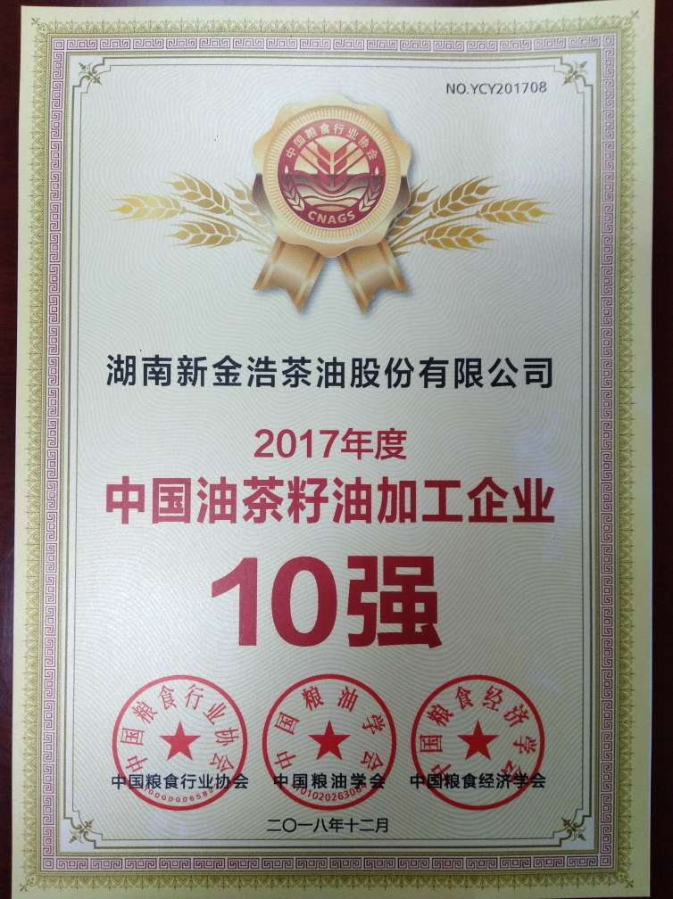 金浩茶油連續(xù)多年獲評全國油茶籽油加工企業(yè)10強(qiáng)