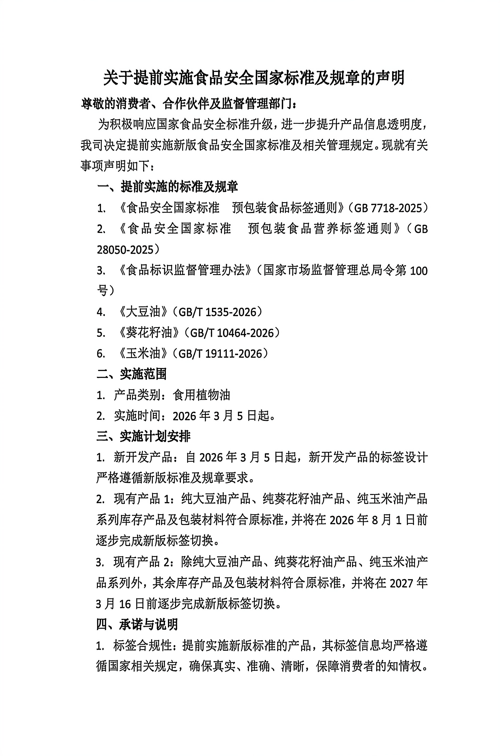 金浩糧油關(guān)于提前實(shí)施食品安全國(guó)家標(biāo)準(zhǔn)及規(guī)章